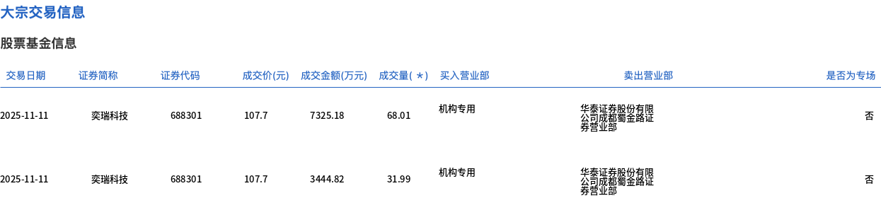 11月11日,奕瑞科技大宗交易成交100万股,成交额1.08亿元,占当日总成交额的30.97%,成交价107.7元,较市场收盘价109.9元折价2%。